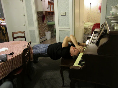 Chris is talented - playing the piano upside down.